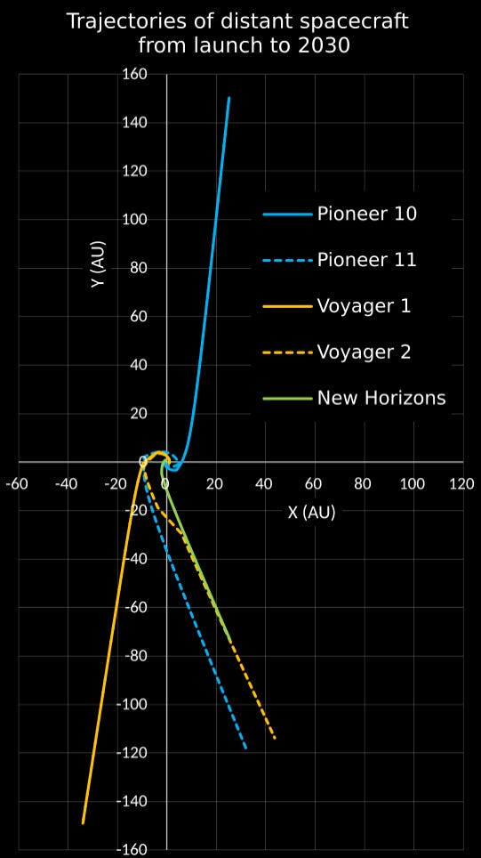The center of the axes is the Earth from a polar view. Notice how the paths of these craft begin with tight turns near the start of their epic journeys but straighten further out. This is because their trajectories were designed to harness the gravitational fields of planets on their path which served to bring them in and then fling them off towards the next, picking up enough momentum so that they will eventually leave the solar system.